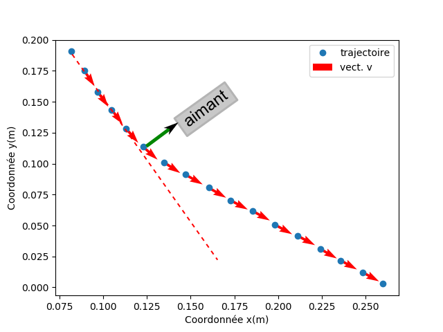 Trajectoire et vecteur-vitesse de la billeForce (en vert) d'attraction de l'aimant sur la bille et déviation de la trajectoire